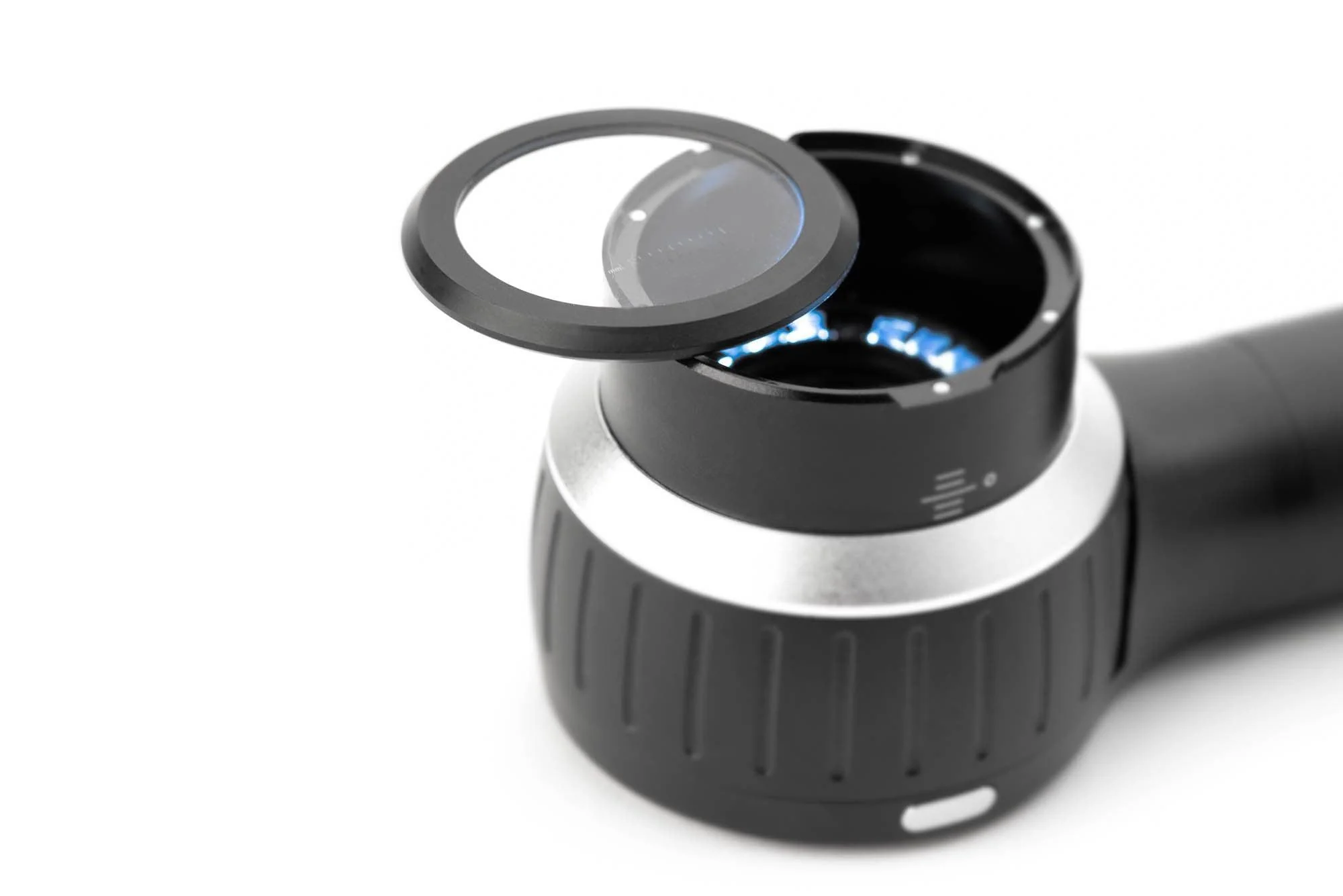 This replacement glass faceplate with 10mm reticle has been precision-machined from high-quality aluminum and attaches magnetically to any DermLite® DL4 model.